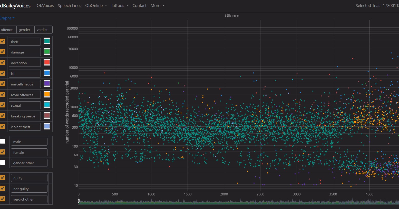 The Proceedings of the Old Bailey 1674-1913 is a 'fully searchable edition of the largest body of texts detailing the lives of non-elite people ever published, containing 197,752 trials held at London's central criminal court, and 475 Ordinary's Accounts of the lives of executed convicts.' One of the most interesting ways of exploring these records is through the Macroscope, or graphic representation of the data found here. By adjusting the filters, you can see on the graph offenses committed by women for example, and then explore the trial transcripts.